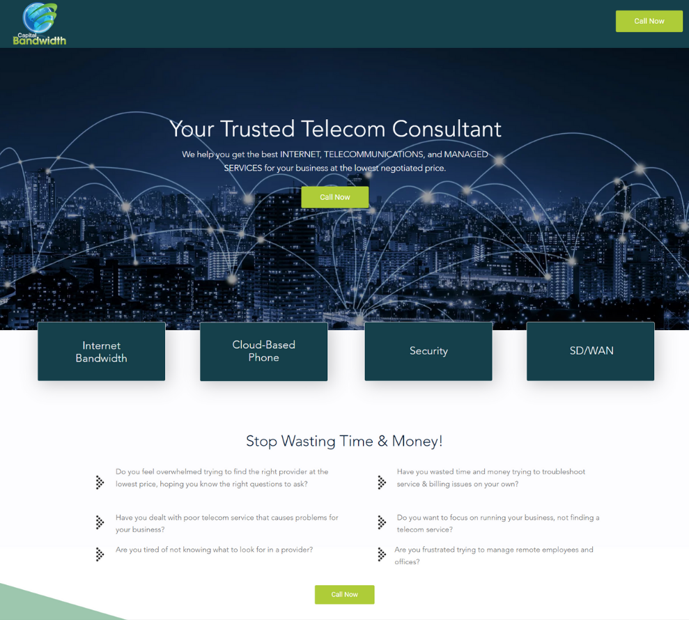 Capital Bandwidth is a small family business that acts as a broker between technology companies and businesses. When a business’ technology is outdated, the business is moving, or they just need a new tech solution, Capital Bandwidth is there to help. The best part? Their services are absolutely free. Capital Bandwidth has been in business for over 12 years and their website has been around since then, too. They came to us in need of a website and brand messaging revamp, and we got to work. It was important to make sure that the messaging we created reflected Capital Bandwidth’s uniqueness as compared to their competitors so that their WIX website and marketing helped them stand out among the others, and that’s exactly what we accomplished.
