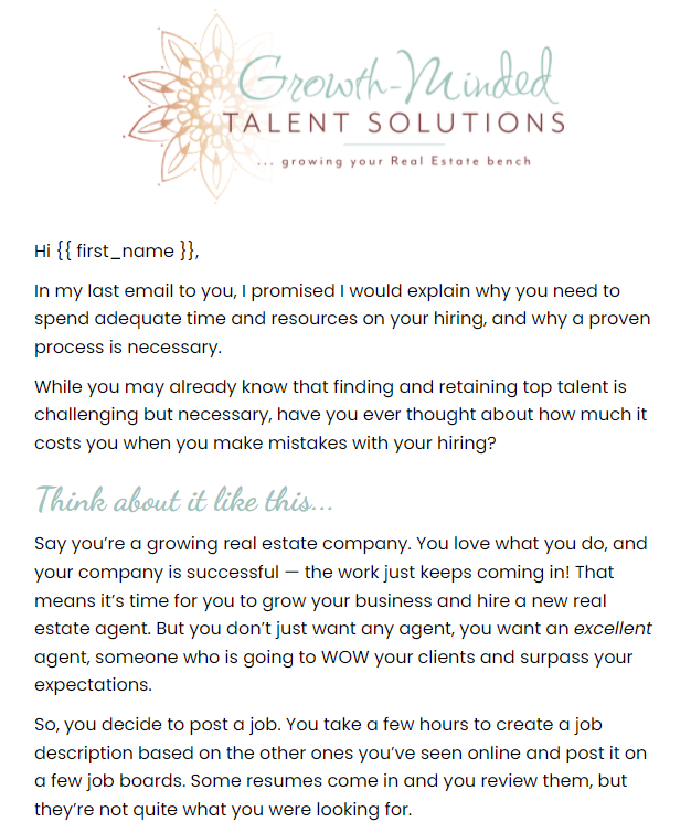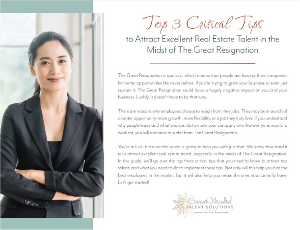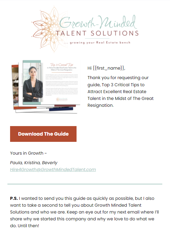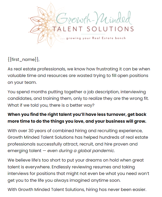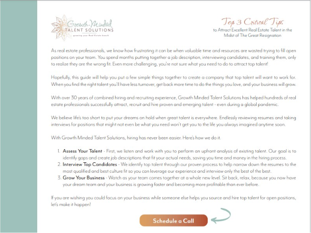 When real estate agents start their own businesses, they usually do so with the intention of spending time with their clients…not spending time trying to find people to join their team. Growth Minded Talent Solutions was founded by a phenomenal former real estate agent who identified a gap in the industry. Real estate agents are ready to grow their business, but they cannot find suitable talent to join them. They don’t have the time or expertise to figure out how to find, hire, and train them. Growth Minded Talent Solutions helps real estate professionals hire proven and emerging talent so they can grow their business. The owner came to us with her start-up ready to launch, but she needed a website, automated sales funnel, logo, and marketing materials. We absolutely loved helping Growth Minded Talent Solutions develop their brand identity including a custom logo and lead generating PDF, build out their website on LeadPages, and create their automated sales funnel on Keap/Infusionsoft. By the time we were finished with them, Growth Minded Talent Solutions was ready to launch their amazing business and had the digital marketing solutions they needed to succeed.