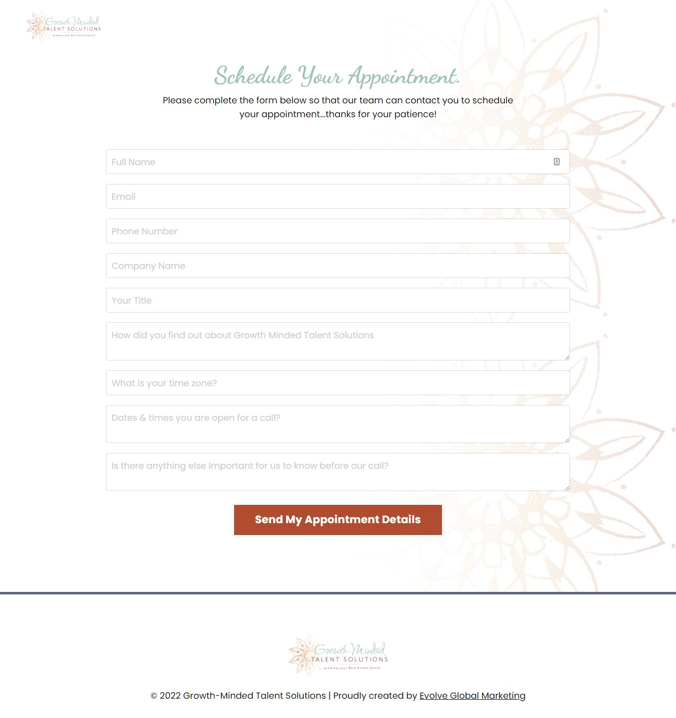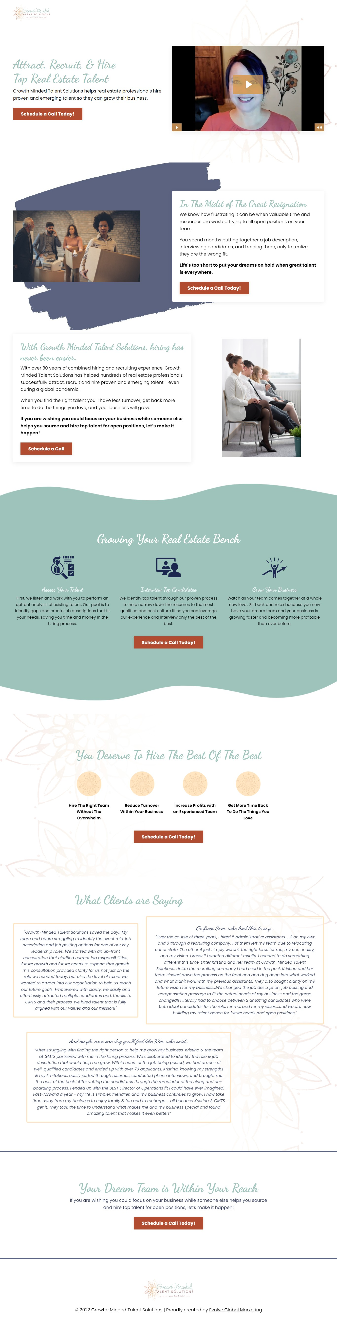 Strategize, create, and execute on the website, sales funnel and marketing assets needed to launch a brand new real estate recruitment start-up. All of the messaging needed to clearly communicate the problem that Growth Minded Talent Solutions solves, and how they do it. As a unique business in this industry, their potential clients may not even recognize that this is a problem, so the messaging needed to be simple and clear, yet incredibly effective. Similarly, the logo, design, and marketing assets needed to be reflective of the brand identity.