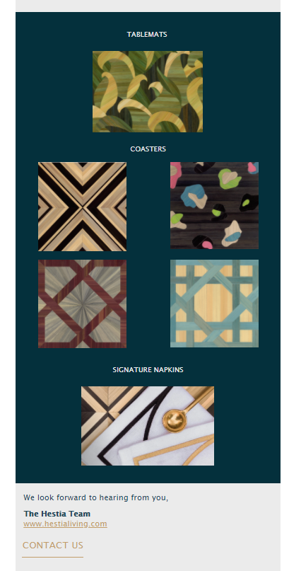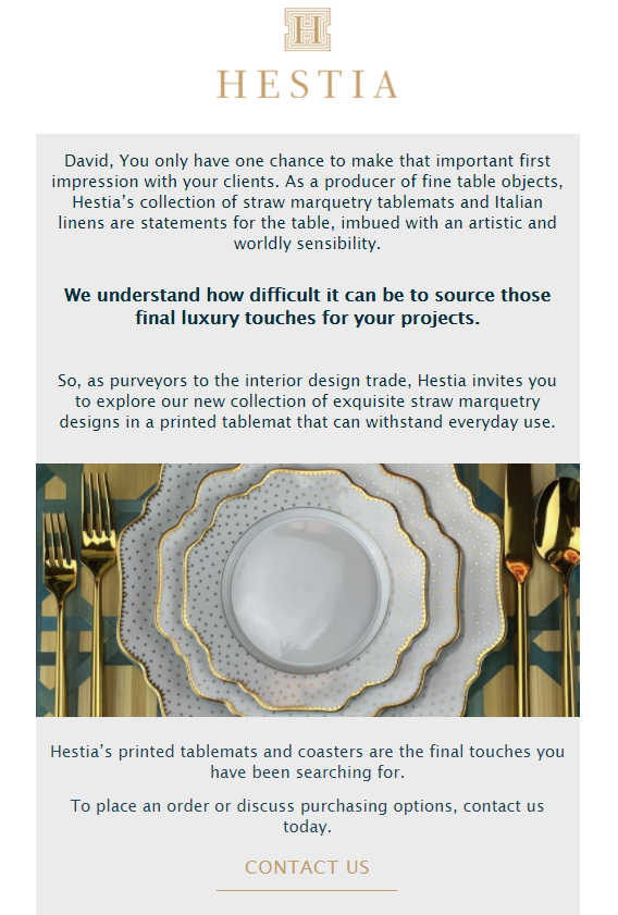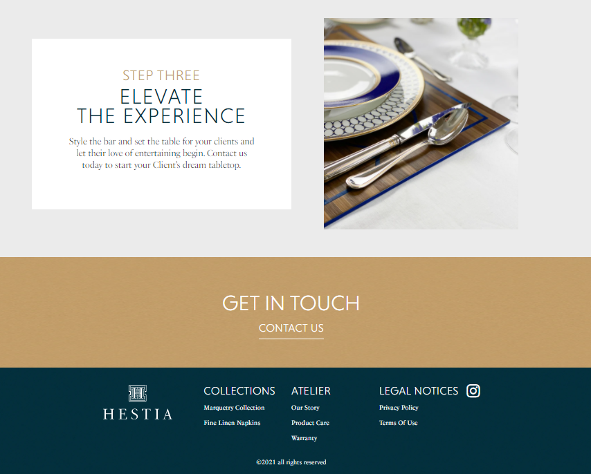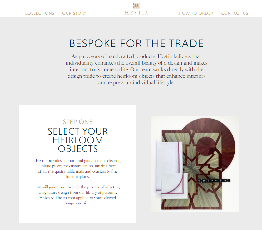Hestia Living is a high-end brand that sells luxury hand-crafted marquetry tabletop accessories to interior designers and luxury boutiques. Hestia’s main products are individually crafted artisanal mats and coasters. They came to us needing to clarify their brand messaging for Hestia Living and their new line of elegant printed tablemats and coasters for everyday use. We started off by creating new brand messaging, incorporating aspects of story-based messaging while staying true to their unique brand personality. While we love StoryBrand, not every brand needs the full 7-part framework. So, when creating their Brand Identity Guide, brochure, automated sales funnel, and sales landing page copy, we kept our StoryBrand principles in mind while tailoring our process so that their branding perfectly fit their needs. Once we finished the strategy and copy, we moved on to finish with design and development, still keeping in mind their unique positioning and story needs. We loved working with Hestia Living to make their new branding as memorable as their products!