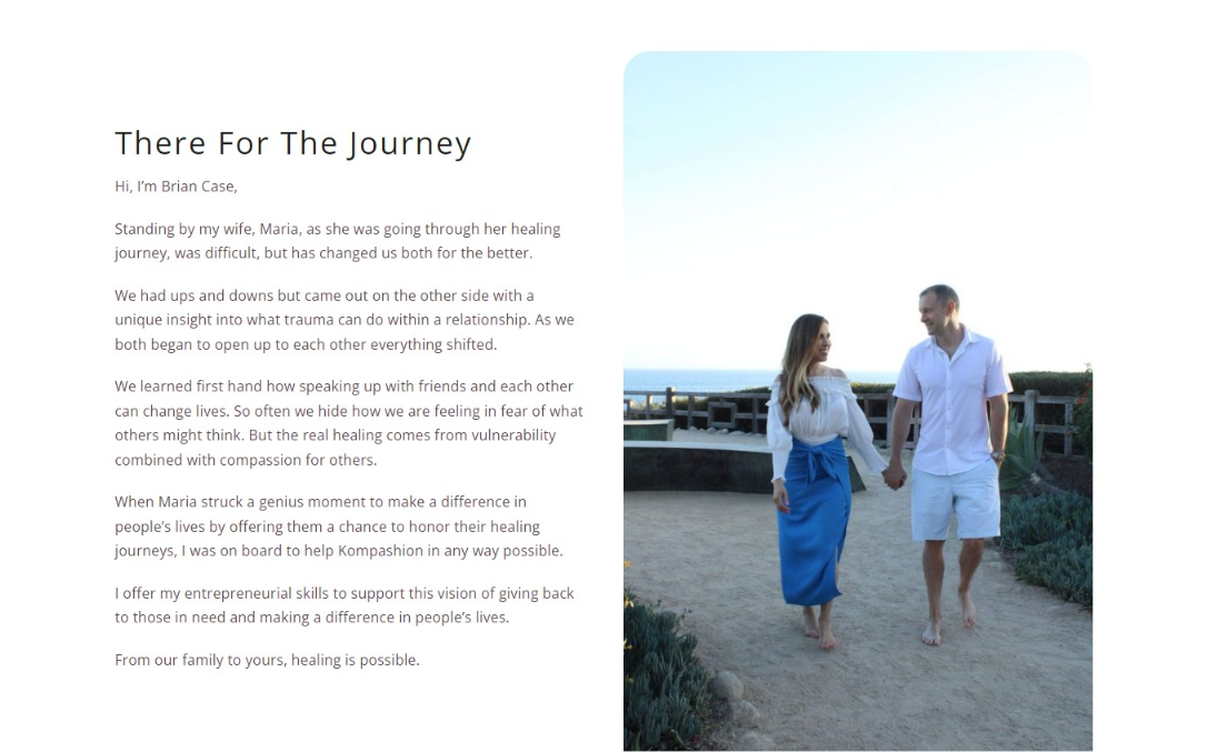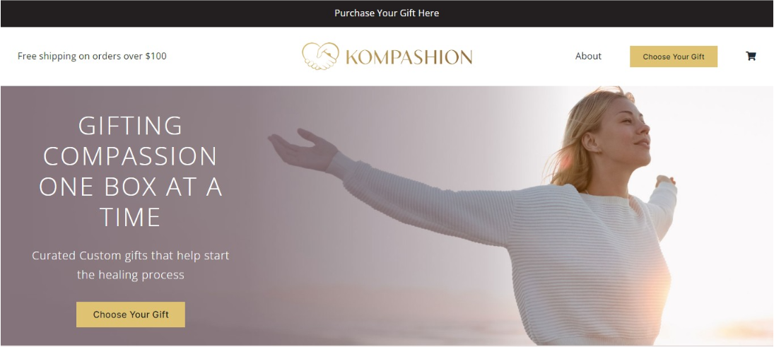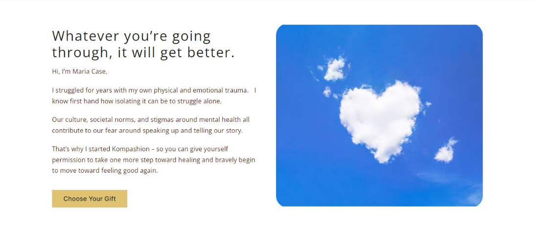 Kompashion is a startup ecommerce company started by Maria Case and her husband Brian. After struggling for years with her own physical and emotional trauma, Maria started this compassion driven gift box company. She believes the first step for anyone healing from trauma is compassion.